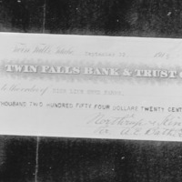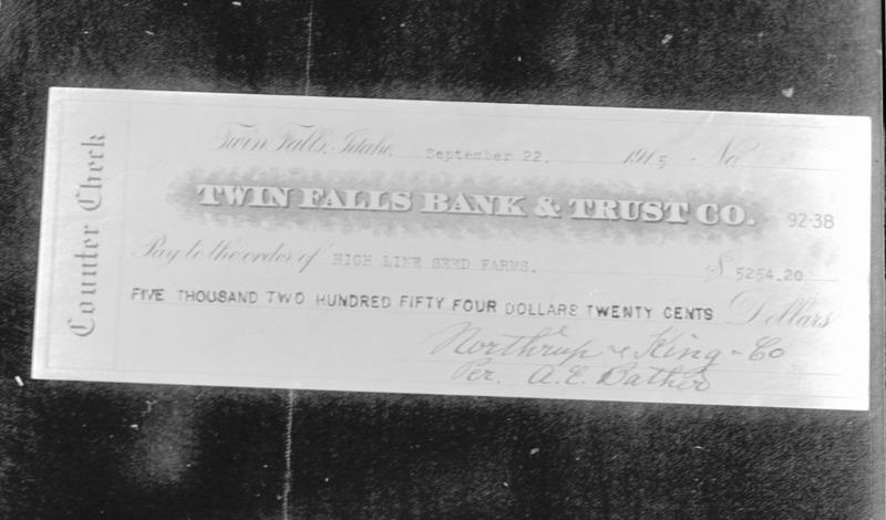 - A check from the Twin Falls Bank and Trust to High Line Seed Farms for $56,254.00. September 22, 1915; Signed by A. E. Bather for Northrup, King and Co.