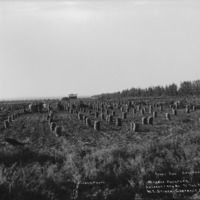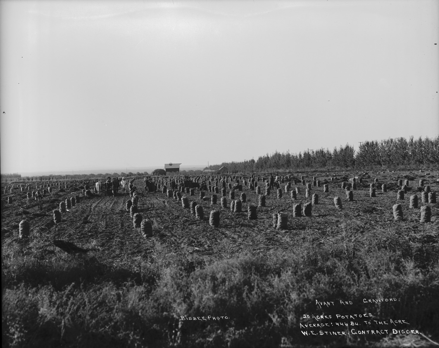 - Avant and Crawford. 20 acres of potatoes. Average 446 bushels per acre. W.E. Stiner, Contract Digger.; Men and teams of horses in field with bagged potatoes; barn is visible in background.