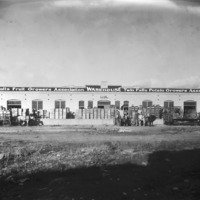 Twin Falls Fruit Growers' Association and Twin Falls Potato Growers Association Warehouse; wagons with teams of horses waiting to load or unload; crates fill the area in front of the building; 1914, the year the building was constructed is painted above the middle entrance