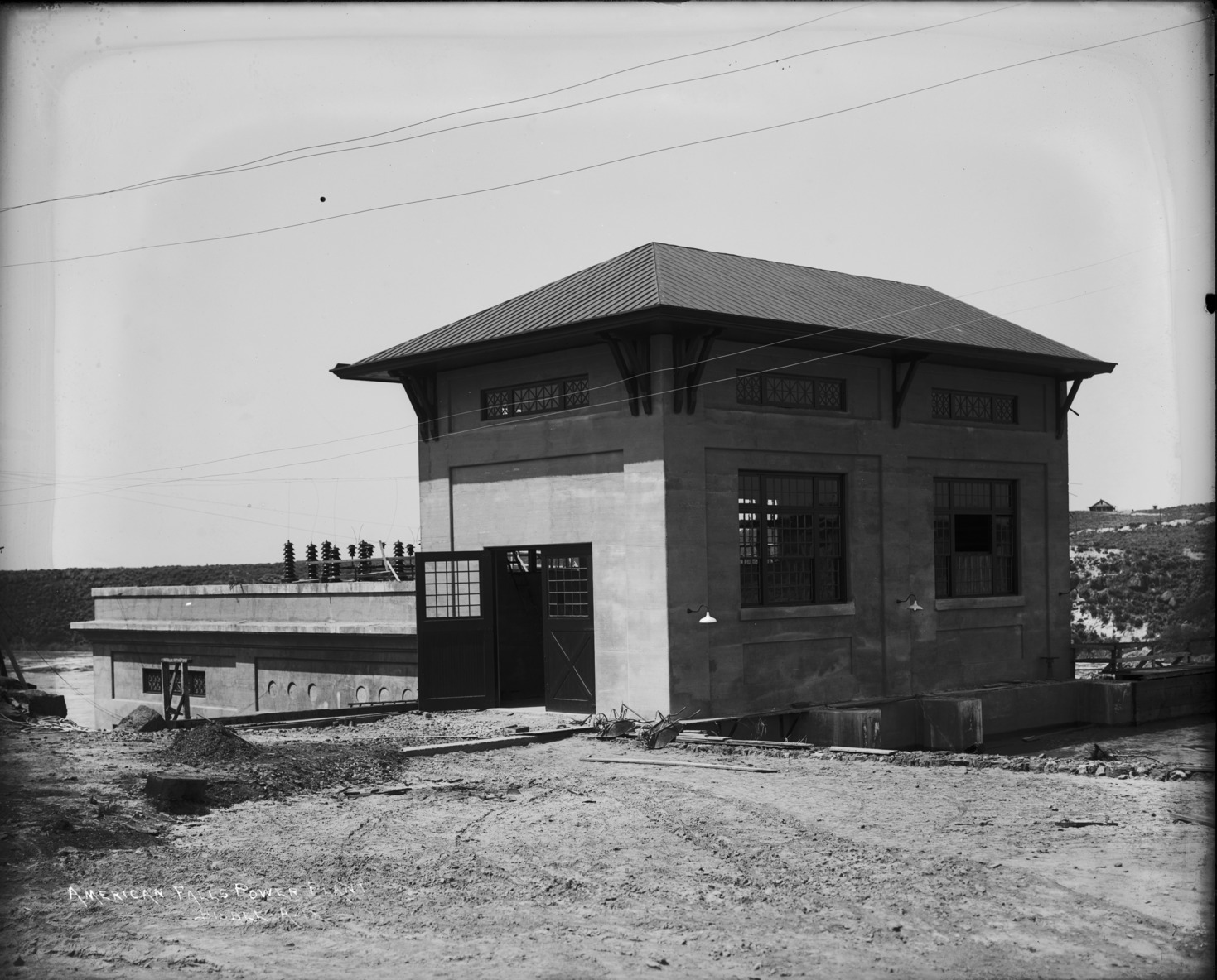 - "American Falls Power Plant;" view of newly constructed power plant building.