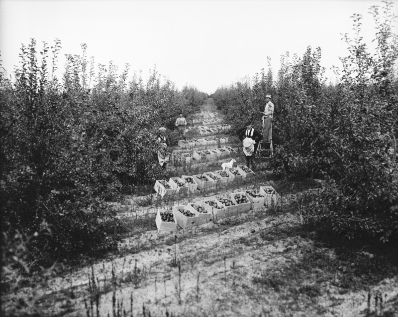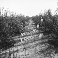 - Looking down a row of trees, at four men, one on a ladder, and a dog; rows of boxed apples between the trees; Orchard of John Baisch, 1/2 Mile South of Kimberly, Idaho