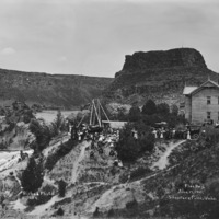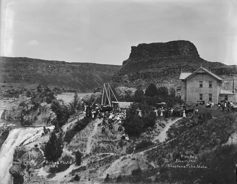 - "Flag Day, June 17th, 1910; Shoshone Falls, Idaho;" Group of people posing near Ezra Meeker, his wagon and oxen in the middle distance. Shoshone Falls Hotel at right.