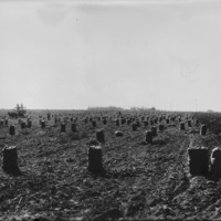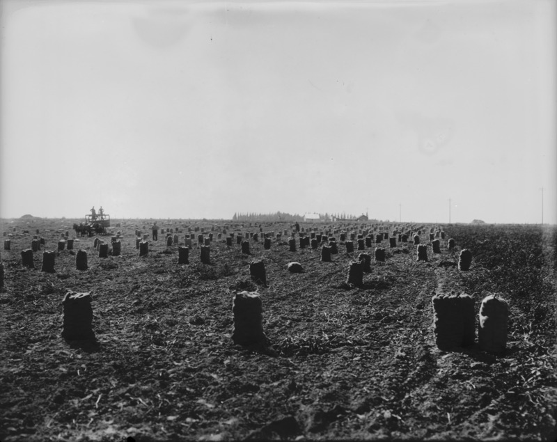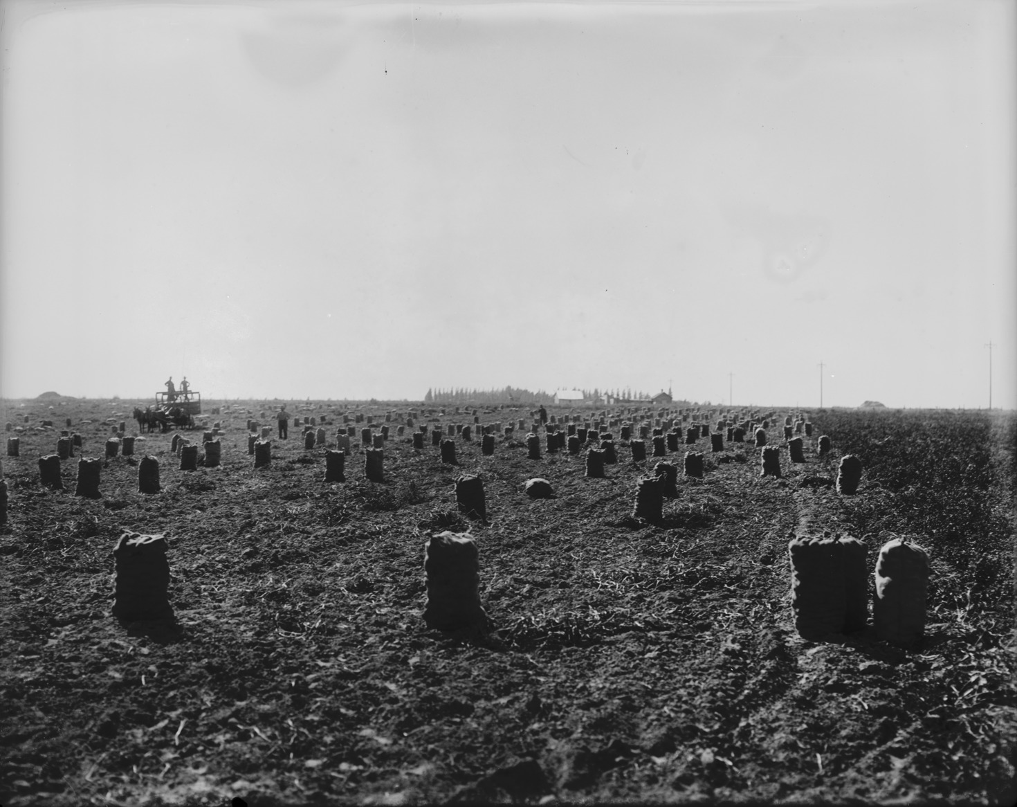 - Wide view of rows of bagged produce in a field.