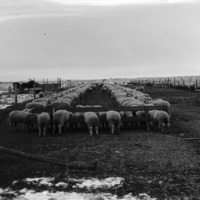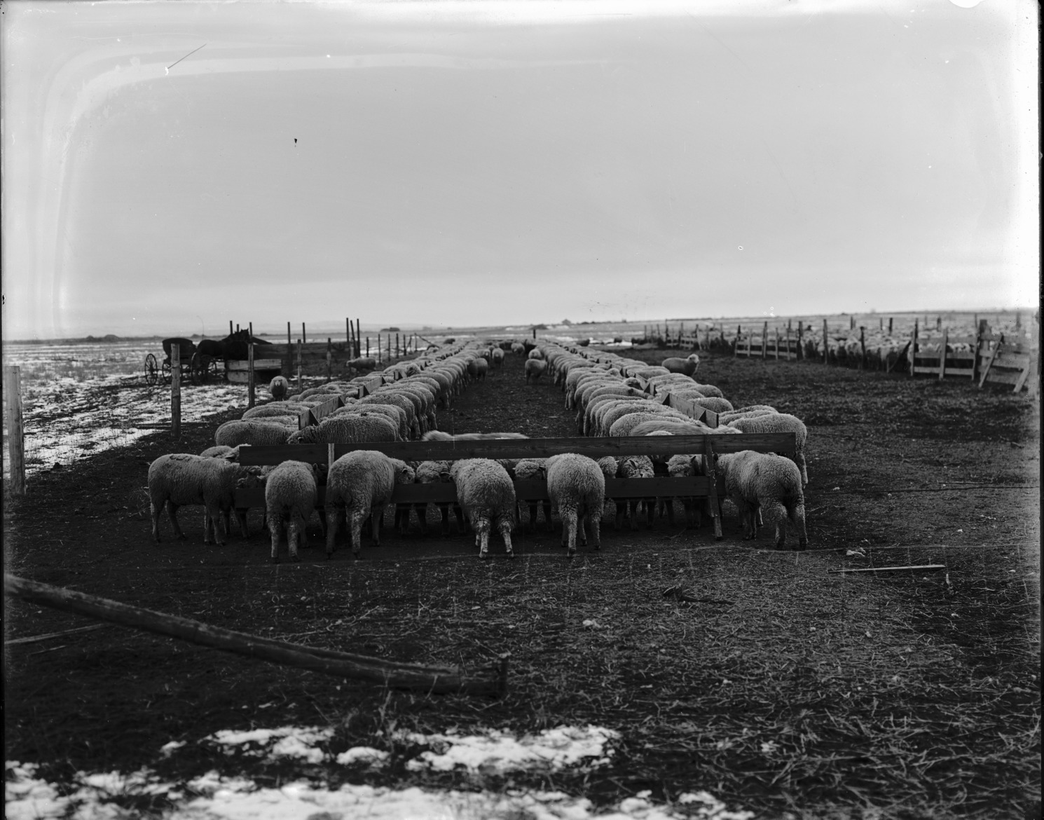- Sheep feeding outdoors at long troughs; a horse and buggy on the left