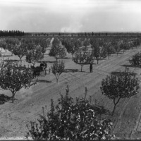 - Three people, one standing and two in a horse and buggy, in an orchard.