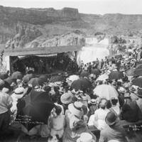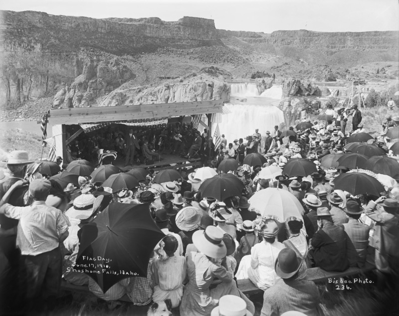 "Flag Day, June 17, 1910; Shoshone Falls, Idaho;" Crowd of people gathered around a speaker's stand, listening to Governor James Brady.