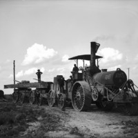 - Large steam tractor pulling four freight wagons, the tractor reads, "The Best Manufacturing Company; San Leandro, Ca; " Number 237. Five men are posed on or about the tractor, which is loaded with construction materials for the Salmon Dam.