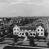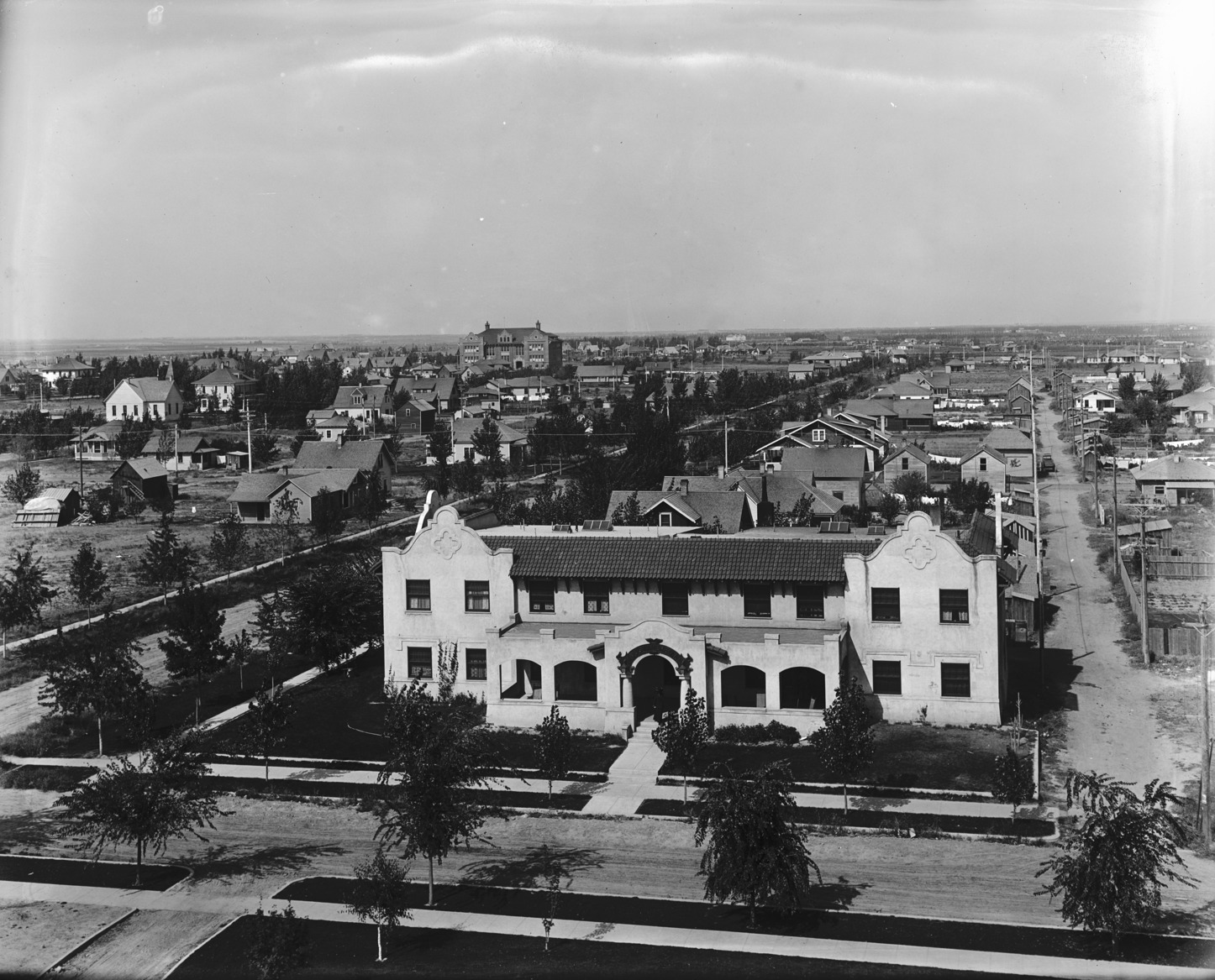 - Wide aerial view of west Twin Falls with the Justamere Inn in the foreground and Lincoln School in the background, residential house and buildings in between. A woman stands on the steps of the building. Taken from atop the Twin Falls County Court House