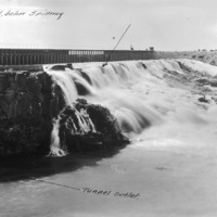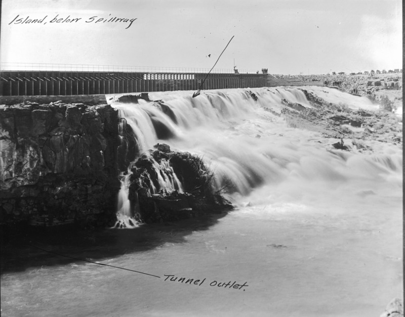 - "Island Below Spillway; tunnel outlet;" at Milner Dam after construction.