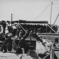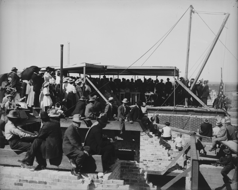 - Lincoln School. Laying the Cornerstone. June, 1908.; A large crowd of people among the construction elements at the school site, listening to a speaker
