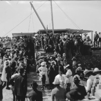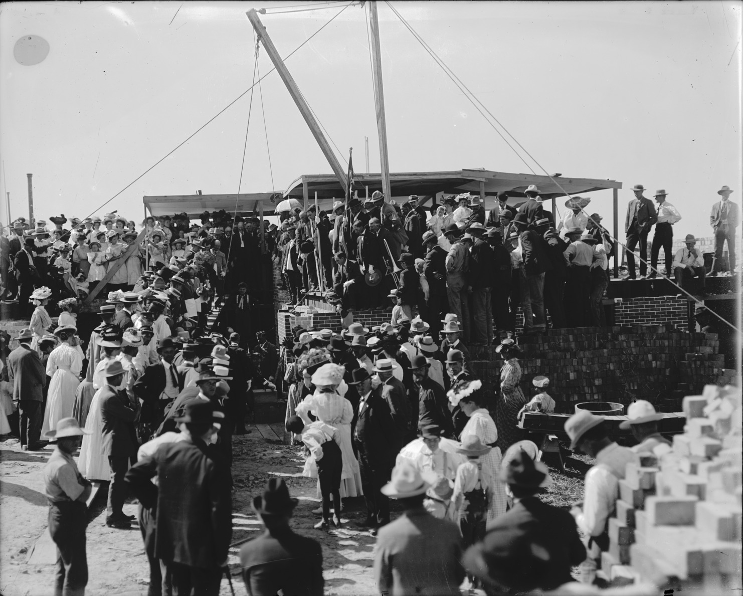 - Lincoln School. Laying the Cornerstone. June, 1908.; A large crowd of people among the construction elements at the school site.