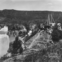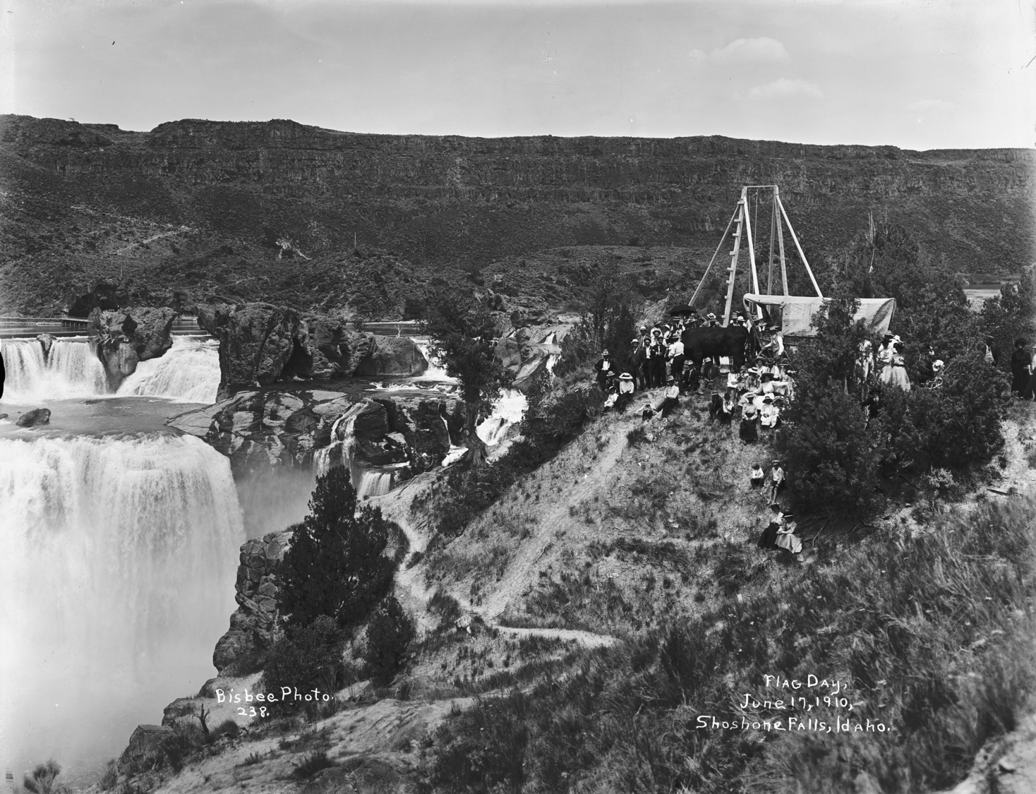 "Flag Day, June 17th, 1910; Shoshone Falls, Idaho;" Group of people posing near Ezra Meeker, his wagon and oxen on the right.