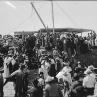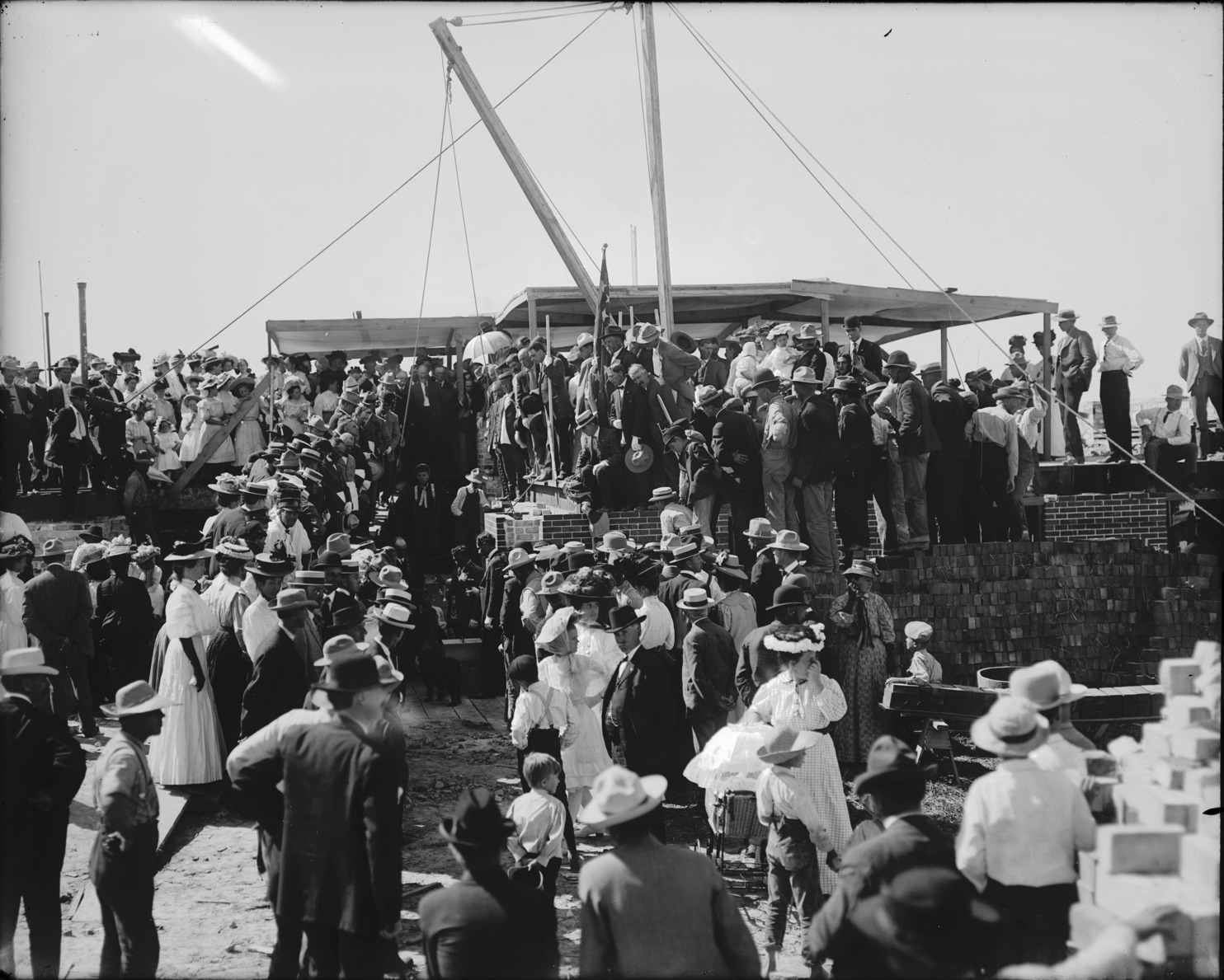 - Lincoln School. Laying the Cornerstone. June, 1908.; A large crowd of people among the construction elements at the school site.