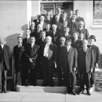 "The First Meeting of the Synod of Idaho. Twin Falls, October 13, 1909;" group of men standing on the steps of the Presbyterian Church.