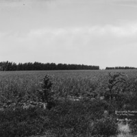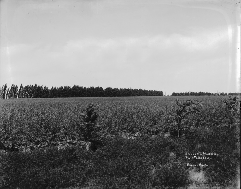 - "Blue Lakes Nursery. Twin Falls, Idaho;" young trees in the foreground and large poplars in the distance.