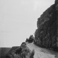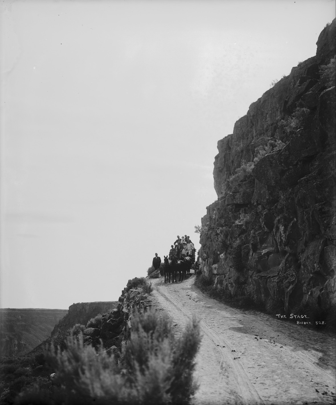 - "The Stage;" several people on a stagecoach, with one man standing on the road, descending on a grade into the Snake River Canyon
