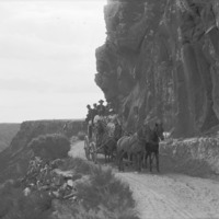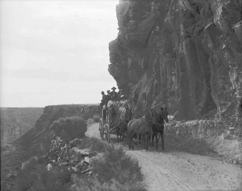 - Several people on a stagecoach, going down a grade into the Snake River Canyon.