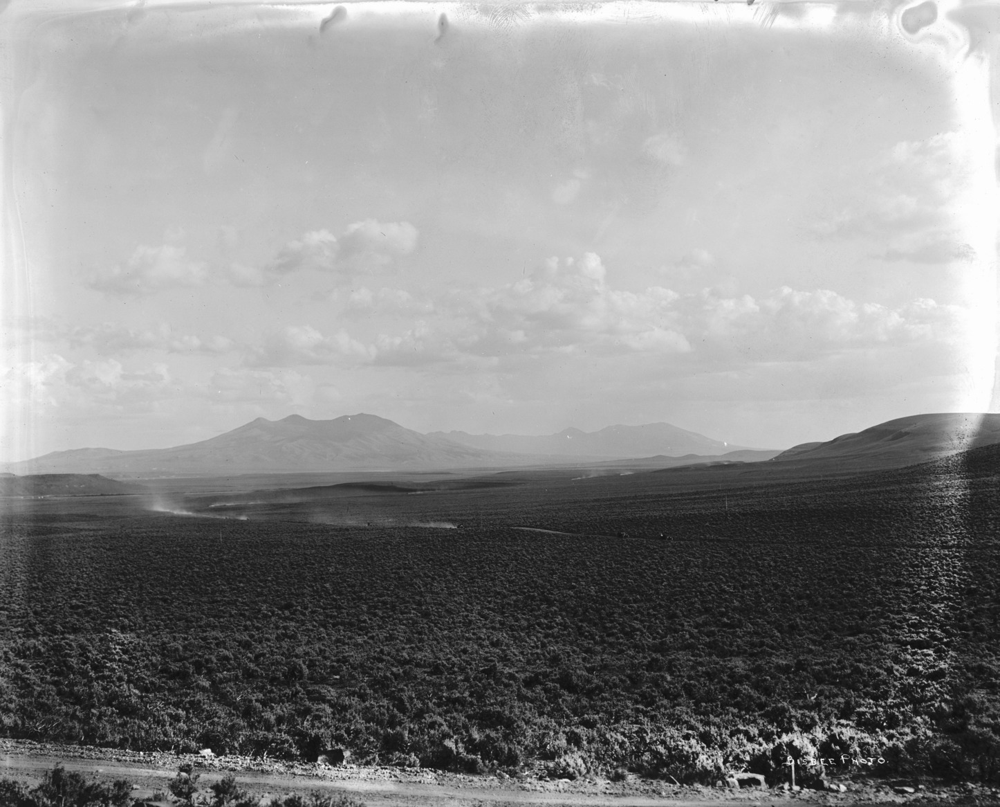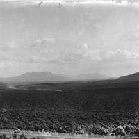 - Open sagebrush plains, with hills in the background. Automobiles (cars) on a road are kicking up dust.