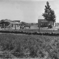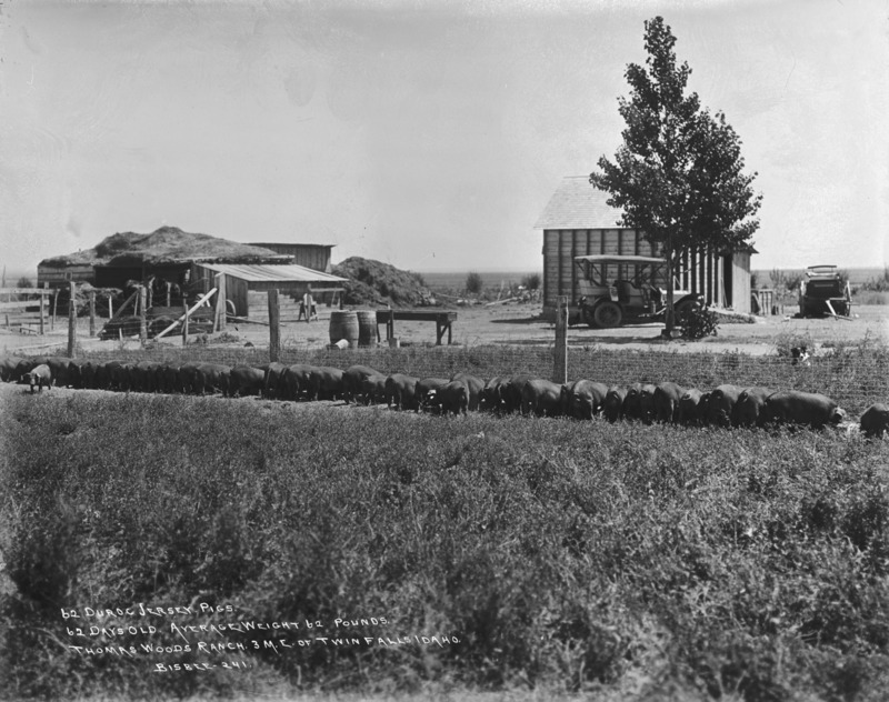 "62 Duroc Jersey Pigs. 62 days old. Average Weight 62 Pounds. Thomas Woods Ranch, 3 miles east of Twin Falls, Idaho;" Pigs lined at a trough on a farmstead; buildings and an automobile/car in the background.