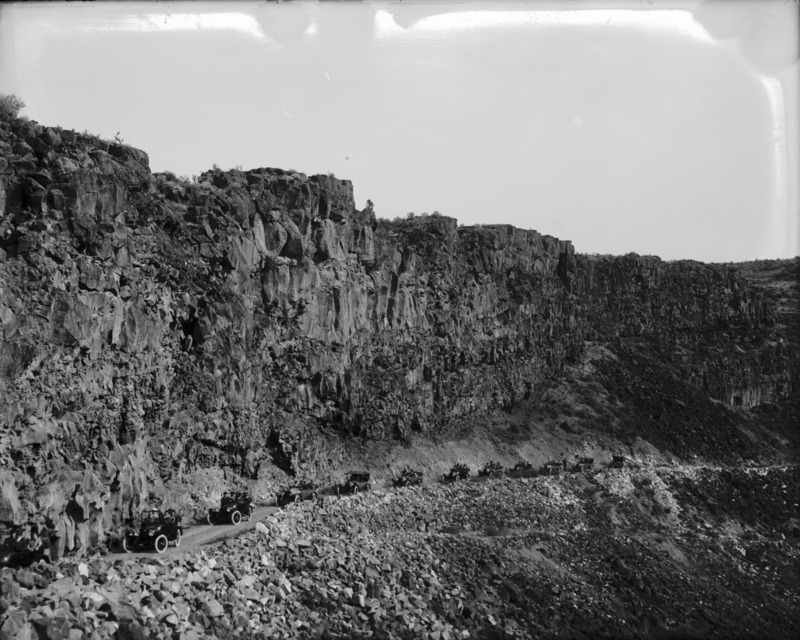 - Twelve Buick automobiles driving down a road in the Snake River Canyon.