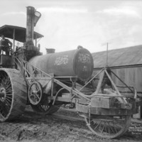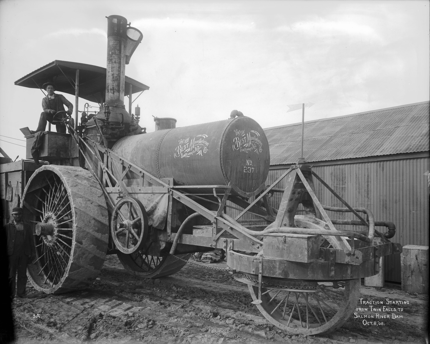 - "Traction starting from Twin Falls to Salmon River Dam; October 8, 1908;"steam tractor; tractor reads, "The Best Manufacturing Company; San Leandro, Ca; " Number 237. One man posed on the tractor.