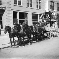 - A stagecoach loaded with men in front of the Perrine Hotel A woman is seated inside.