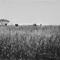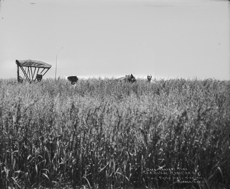 "Oats. Harvest Time; S.H. Bolton Ranch, 3 miles east of Twin Falls, Idaho. 7-25-1910;" Two men and a woman standing beside a buggy, in an oat field.