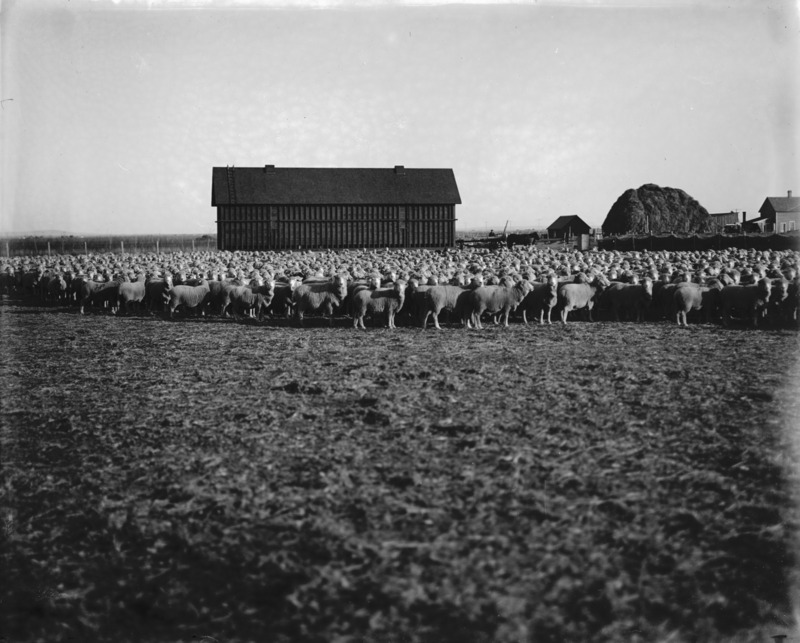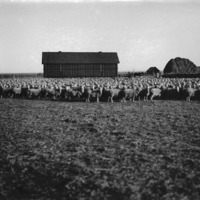 - Large herd of sheep standing in field in front of a barn. Haystack, house, and other outbuildings in background.