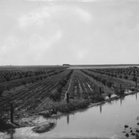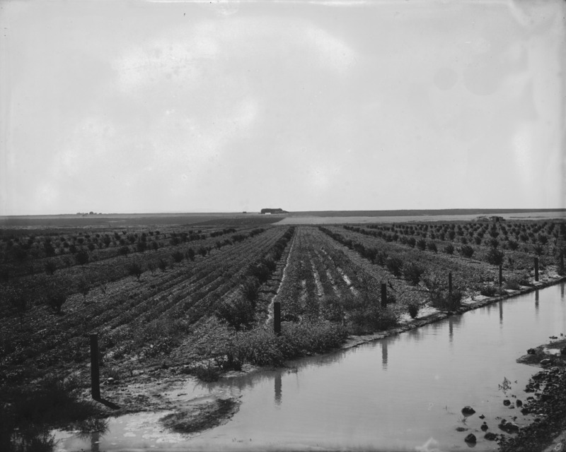 - A first year orchard, with an irrigation ditch in the foreground.