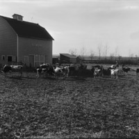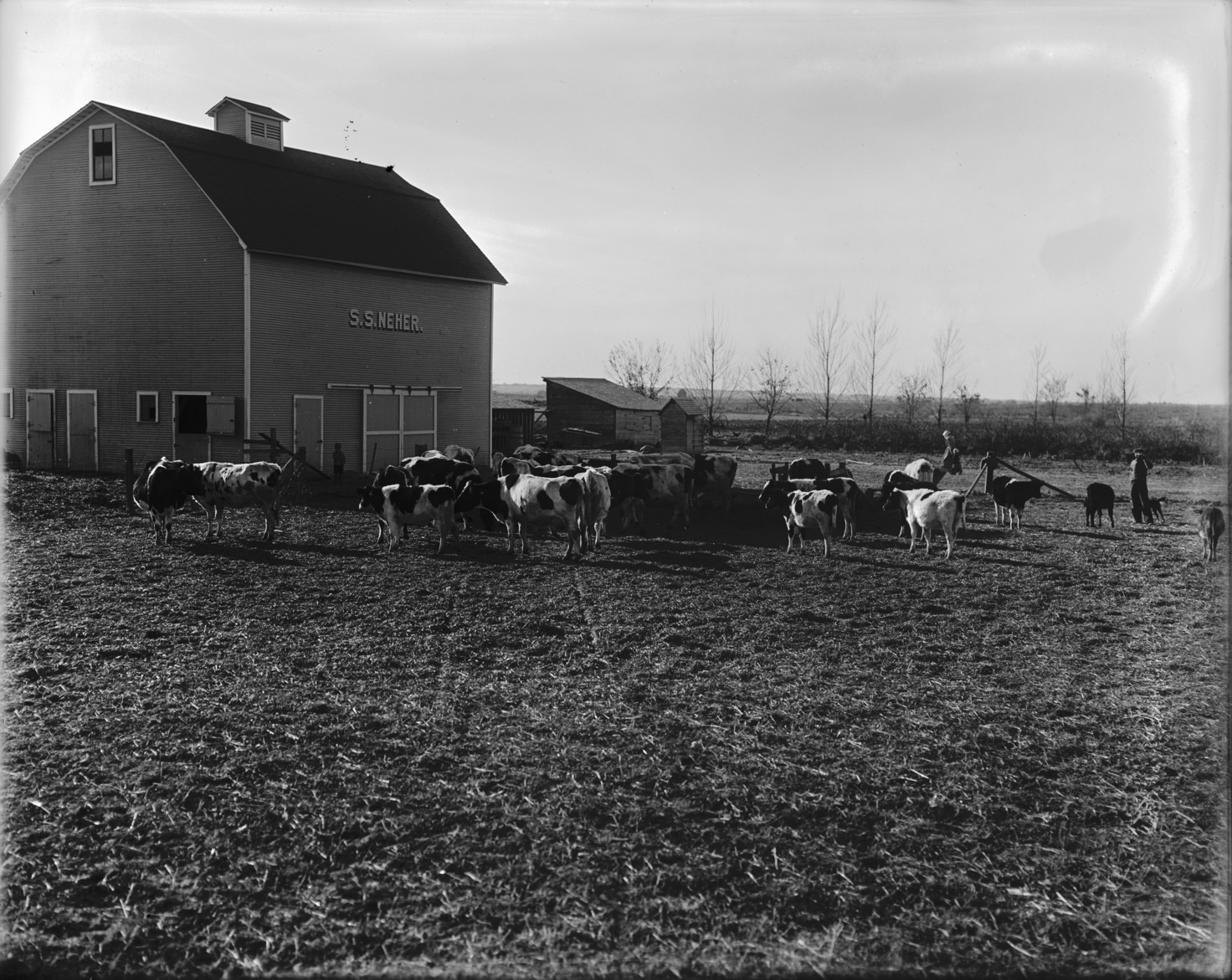 - A small herd of cattle, in front of the S.S. Neher barn. A man, woman, child, and outbuildings in background.