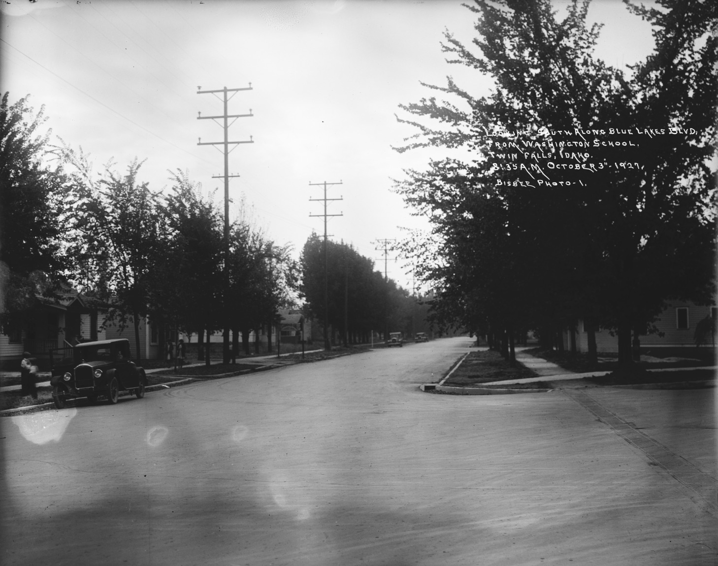 - "Looking South along Blue Lakes Blvd from Washington School; Twin Falls, ID; 8:35 AM; October 3, 1927.