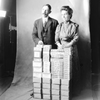 - Clarence E. and Jessie Bisbee standing before stacks of boxes of glass photo plates in their studio.