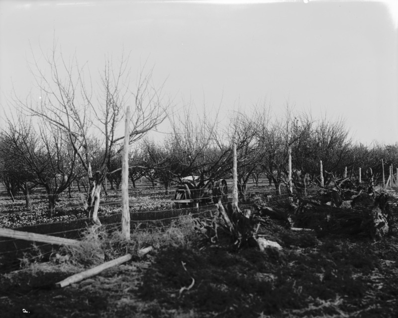 - Orchard with fence and a tractor.