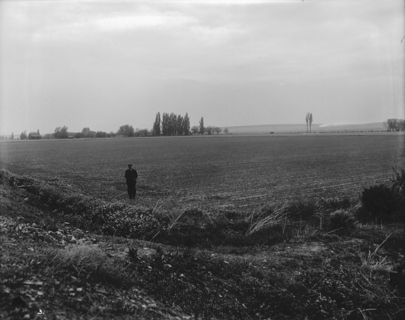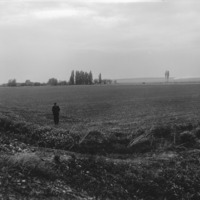 - A man standing in an open field, trees in background.