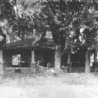 - House made of lava rock, in a grove of trees; family poses on porch.