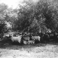 - A band of sheep standing beneath trees.