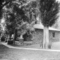 - House made of lava rock, in a grove of trees; family poses on porch.