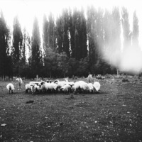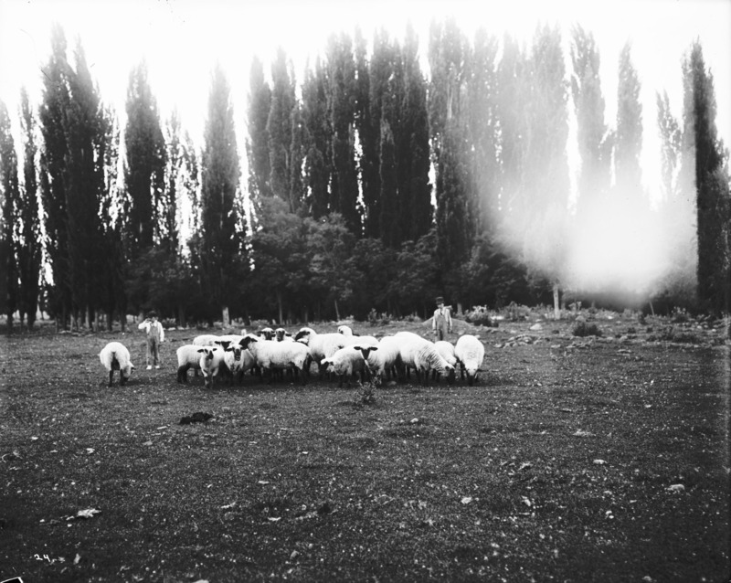 - Two boys stand amid a band of sheep; large poplar trees in background.
