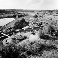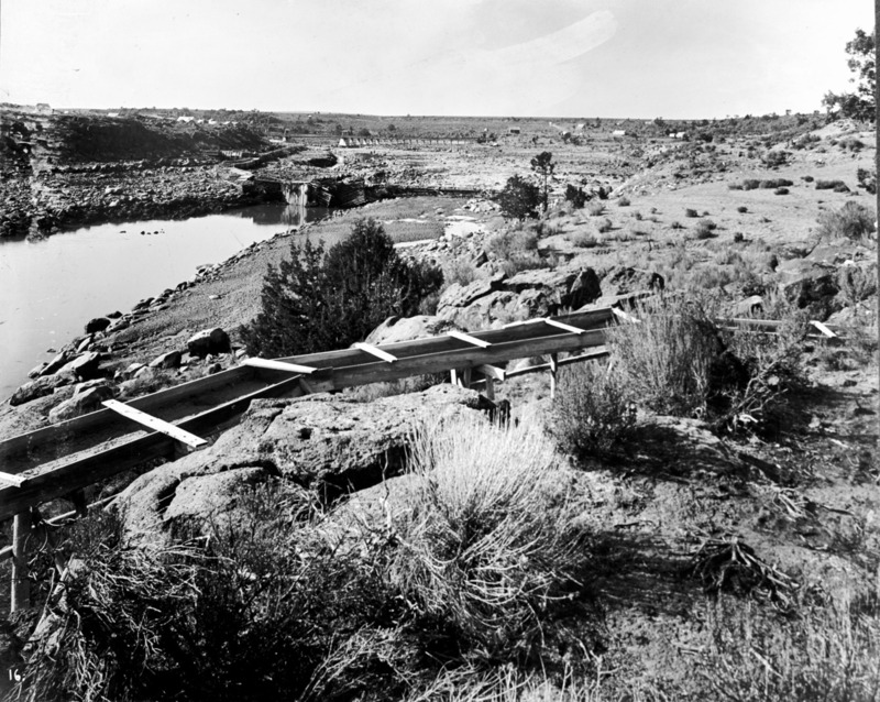 - A view of Milner Dam, with wooden irrigation flumes in the foreground.