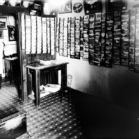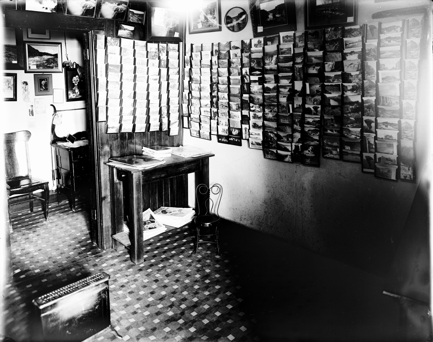 - Interior of Bisbee's studio. Wall covered with with postcards.