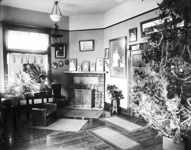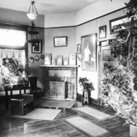 - Christmas tree and fireplace in the Bisbee studio.