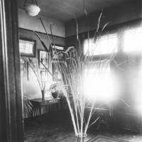 - Interior look at the Bisbee studio, a vase of cattails in the foreground.