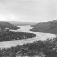 - A large tent and construction camp beside a creek or river.