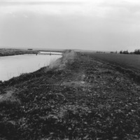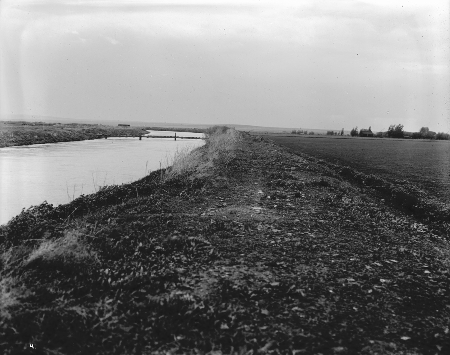 - Long view of a canal; a bridge crosses it in the distance.