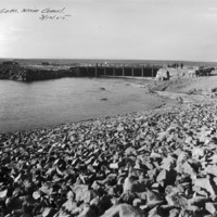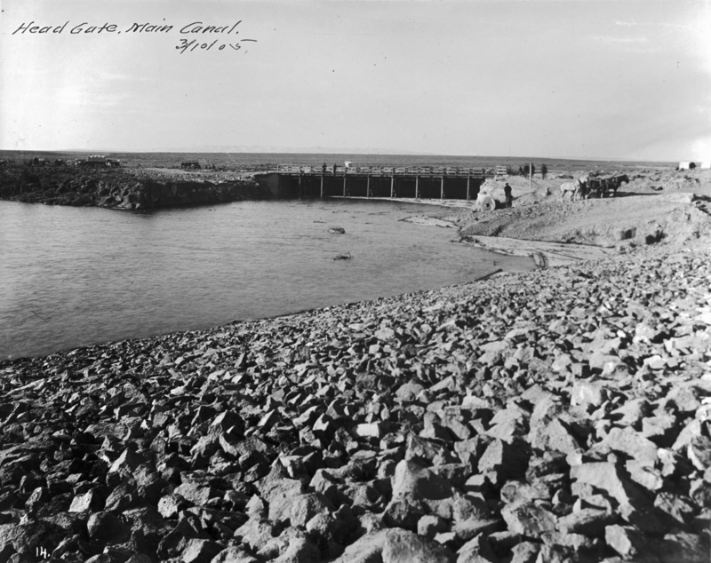 - "Headgate, Main Canal, March 10, 1905;" several wagons and teams of horses in background
