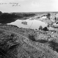 - "Island Below Spillway, March 10, 1905;" view of town of Milner at left.