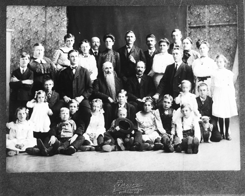 - A photo taken of another photo of a group of people of widely diverse ages. The embossed photo card reads, "Brown; St. Joseph, Mo."