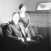 - Portrait of a couple, fireplace in the background.