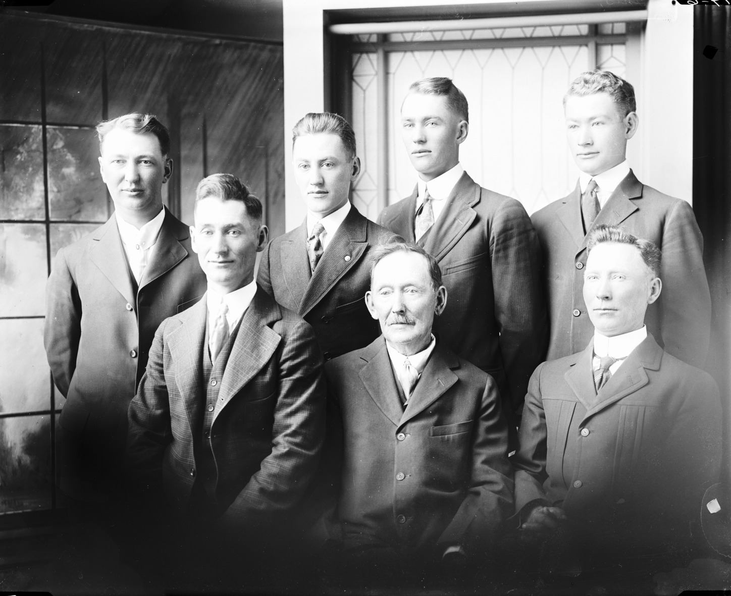 - Portrait of seven men of varying ages, all dressed in suits.
