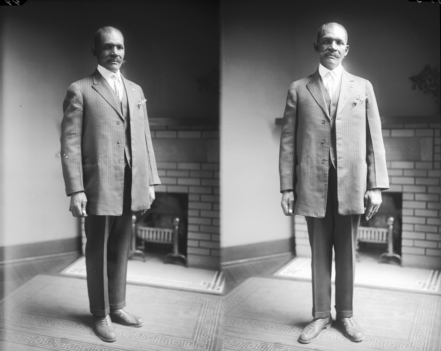 - Two portraits of a man in a suit, fireplace in background.